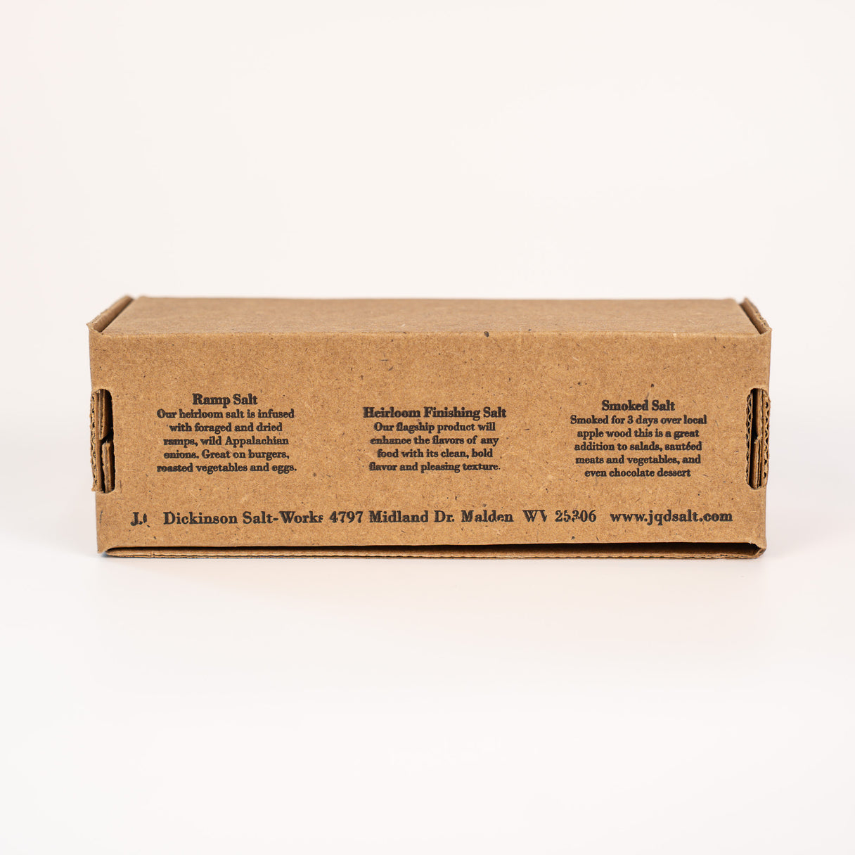Packed in a cardboard box with info about each salt.