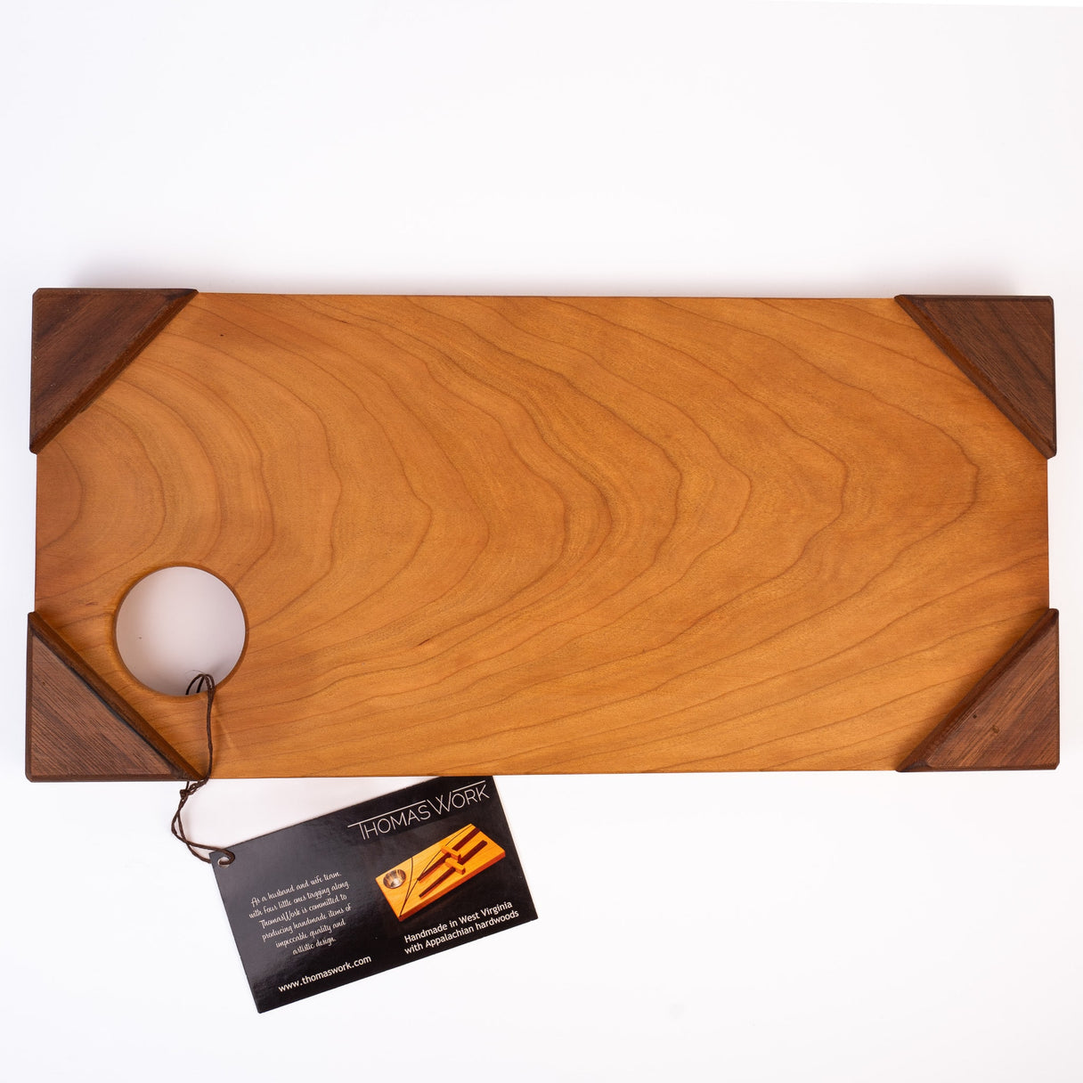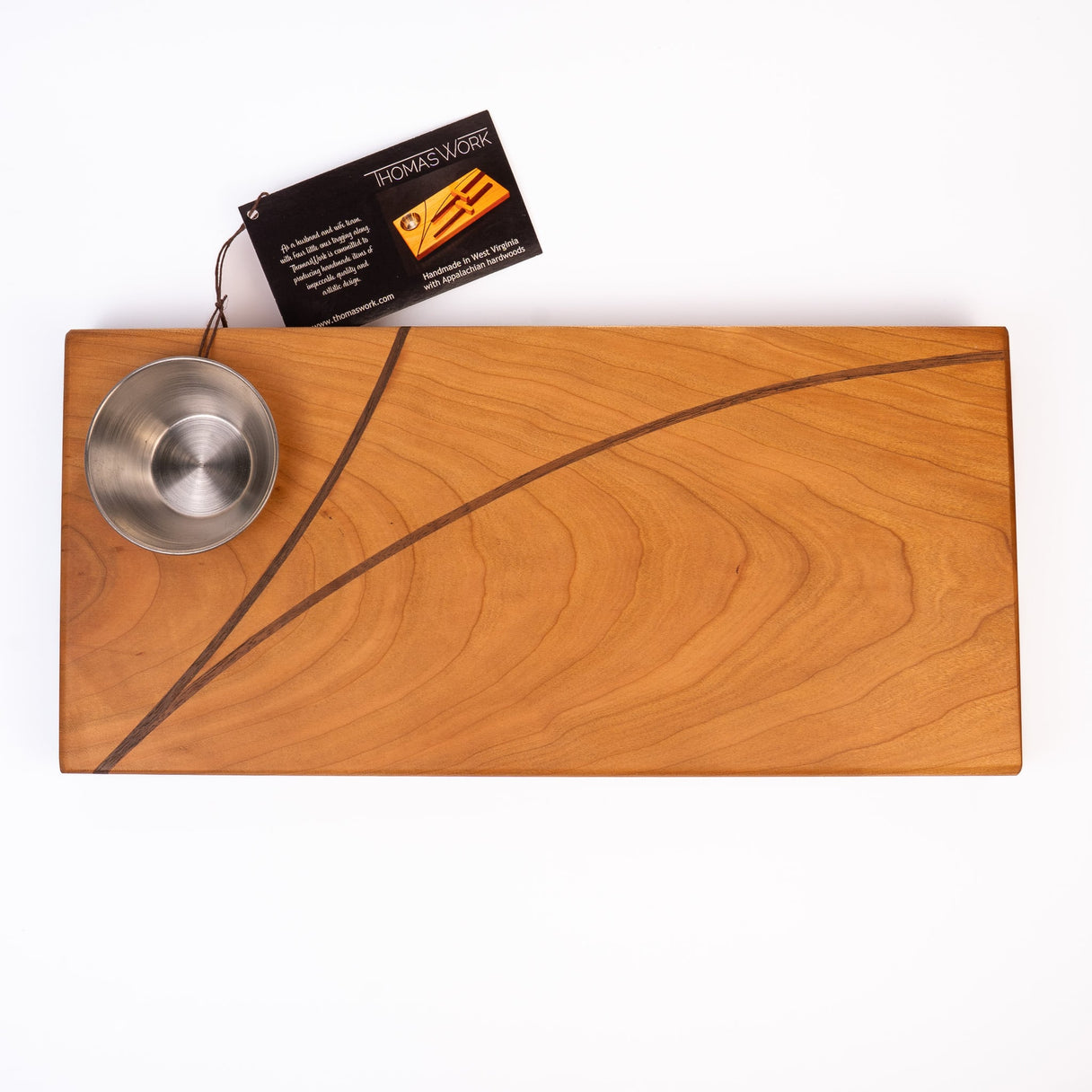 Made by Matt Thomas, of ThomasWorks, in Shock, WV this board is perfect for the sushi lover. Includes a stainless steel cup to hold soy or ponzu sauce. Cherry with walnut inlaid design.