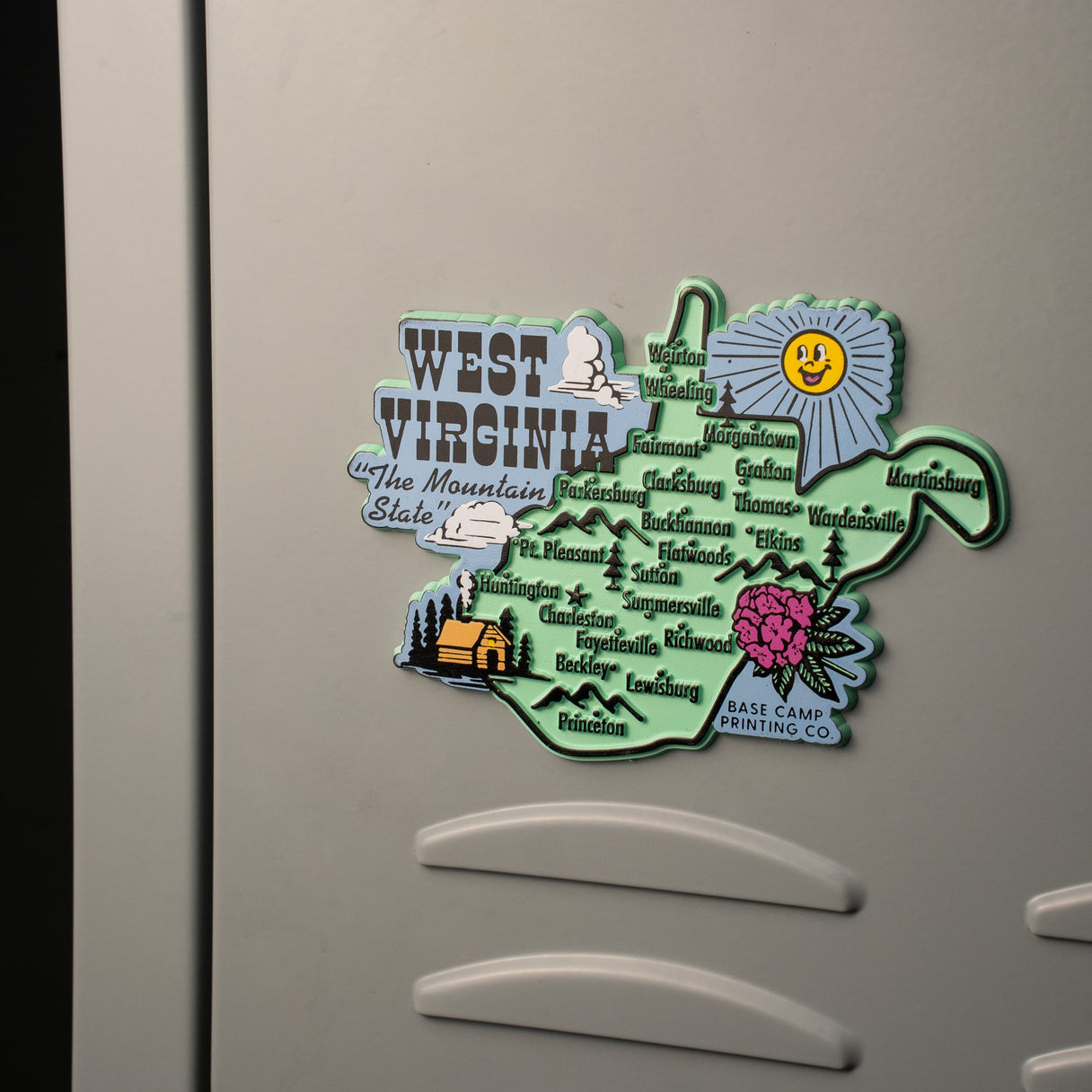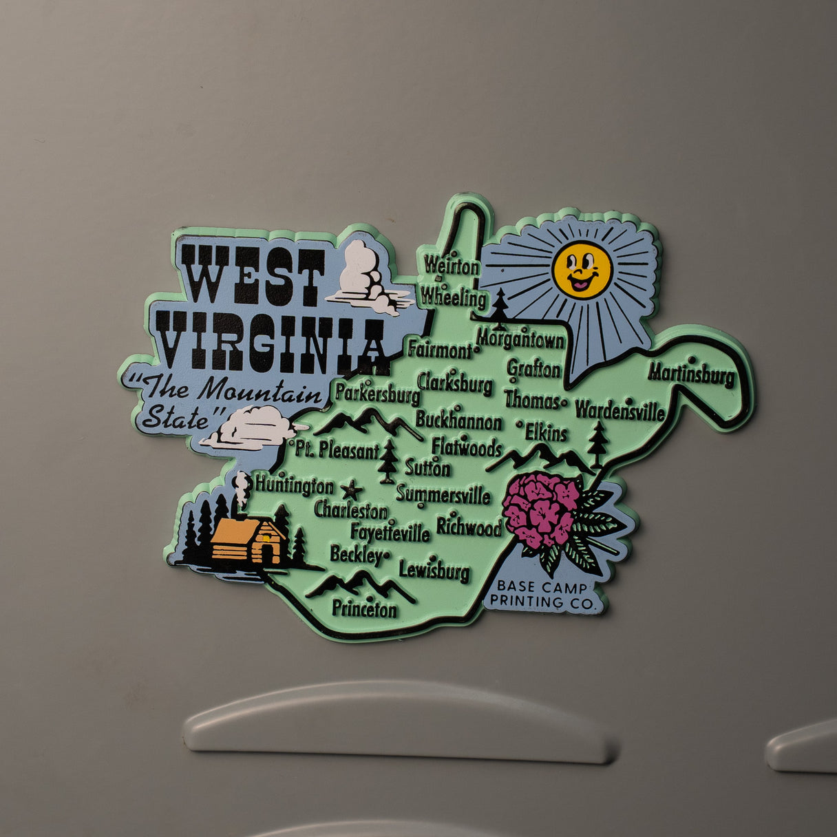 Base Camp Printing Co.'s take on a retro novelty state magnet!