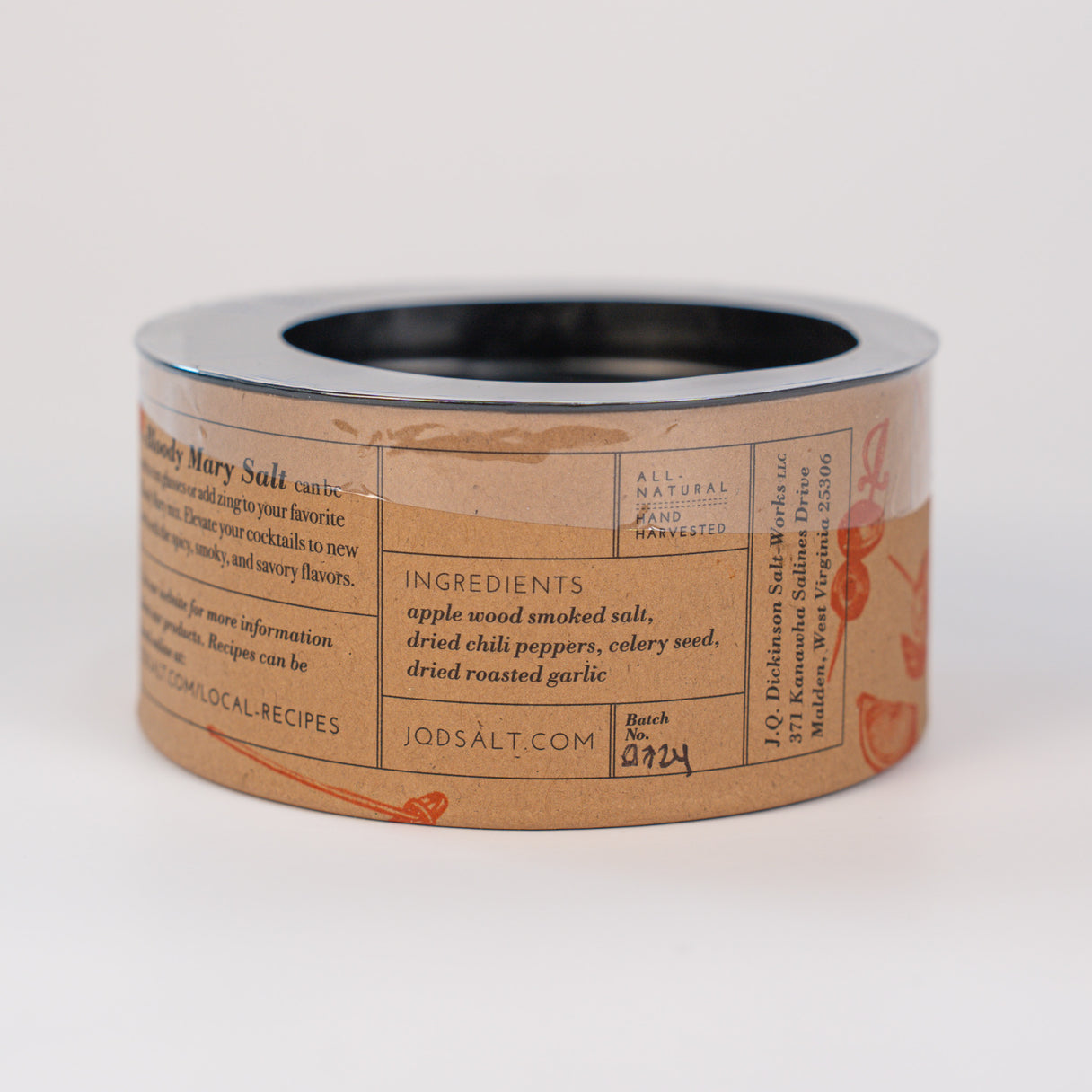 The Bloody Mary salt is made with our apple wood smoked salt, dried chili peppers, roasted garlic and celery seed.
