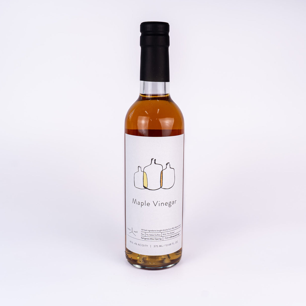 Maple: Starts and ends with Dark Grade B Pennsylvania maple syrup: imagine the syrupy, rich flavor with none of the sweetness. This is a great vinegar to use in warm vinaigrettes or reductions, or in baking.