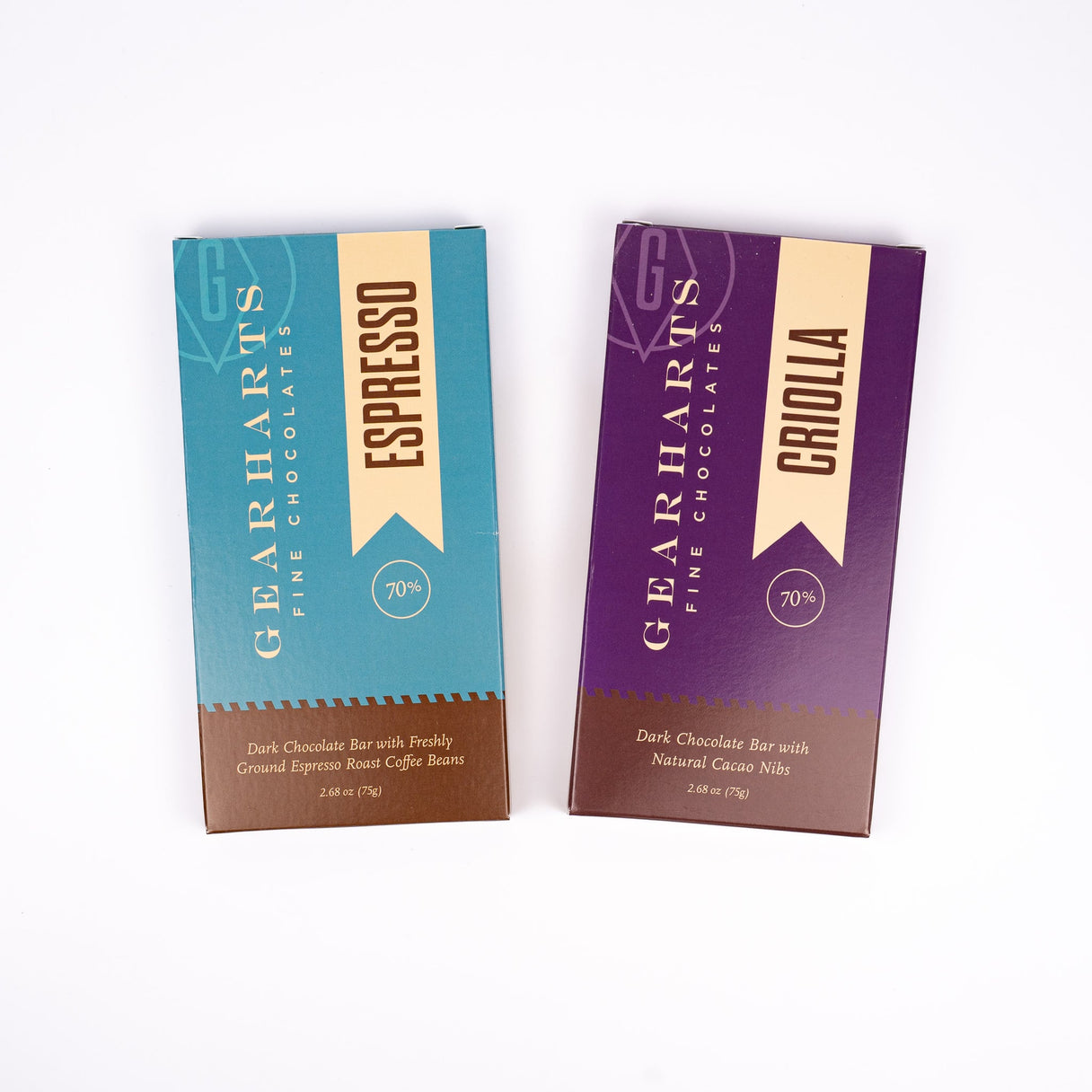 Gearharts Chocolate began in 2001 when chocolatier Tim Gearhart saw a lack of fine artisan chocolates available in the United States. After traveling the world refining his technique, he moved back to Charlottesville to open his shop! These chocolate bars are a testament to his hard work.
